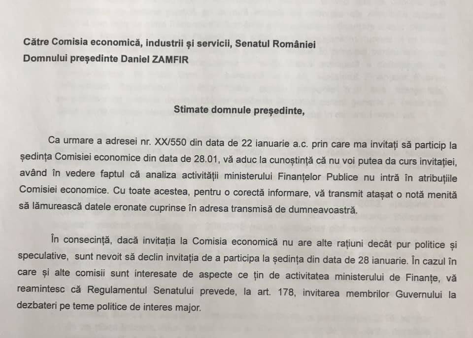 Ministrul Finanţelor Publice, Florin Cîţu, a fost invitat la o audiere în cadrul Comisiei economice din Senat pentru a oferi explicaţii referitoare la împrumuturile ministerului de resort din ultima perioadă, anunțase, recent, Daniel Zamfir.