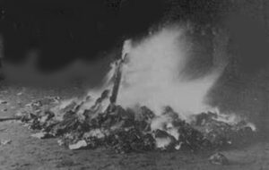 Primul autodafé îl comandă și execută întâiul tâlharăș, scuzați tovarăș numit de partidul muncitoresc director la instituția medicală. Dânsul, (de la acel „am călcat în dânsul” cum neaoș zic unii când calcă într-un rahat) ajuns la sanatoriu cu o plasă de 25 de bani în care avea o pijama (după cum precizează bârfa publică) îi pare că nu are spațiu vital suficient așa că în marele-i avânt loviluțioar, din nou scuze revoluționar, își face loc în birou și noua casă încălzind atmosfera cu o vâlvătaie de mai multe ceasuri, în sens de ore, în care cară și arde tot ce considera mintea-i hodinită că este burghezo-moșieresc deci împotriva stahanovitului popor.