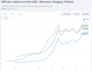 Cum arată datele Băncii Mondiale? În 2020, PIB pe cap de locuitor a fost în Ungaria de 15.899 dolari iar în România de 12.896 dolari. După cum se observă, diferența e în jur de 3000 de dolari. Dacă ne raportăm la indicatorul PIB/cap de locuitor în funcția de calculat la paritatea puterii de cumpărare, care e mai elocvent în comparația nostră, vedem că vecinii noștri au avut în 20020 31.007 dolari iar noi 28.8832 dolari, conform Trading Economics.