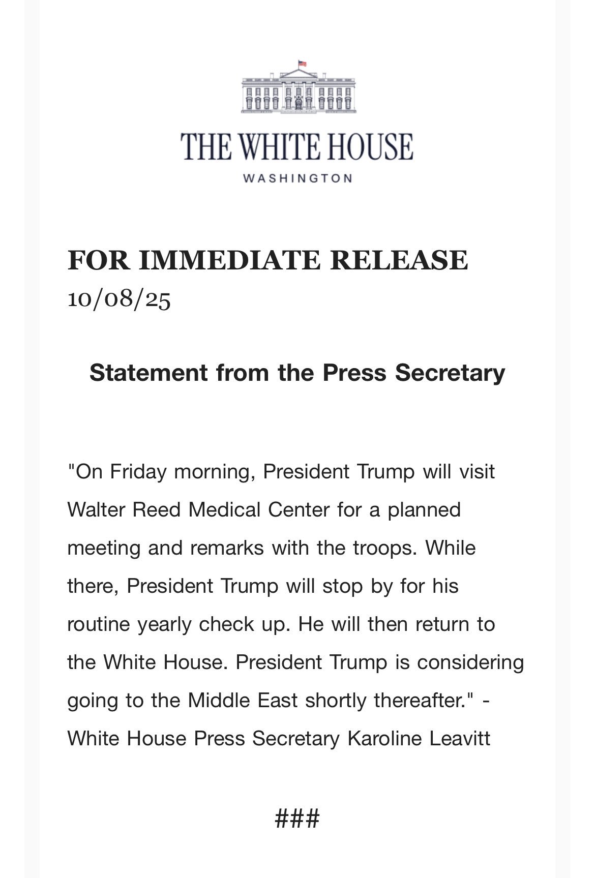Casa Albă a anunțat că președintele Donald J. Trump va fi supus vineri controlului medical anual de rutină la Centrul Medical Militar Național Walter Reed din Bethesda, Maryland, în cadrul căruia va participa la o întâlnire planificată și la un discurs cu trupele, înainte de a pleca într-o posibilă vizită improvizată în Orientul Mijlociu.