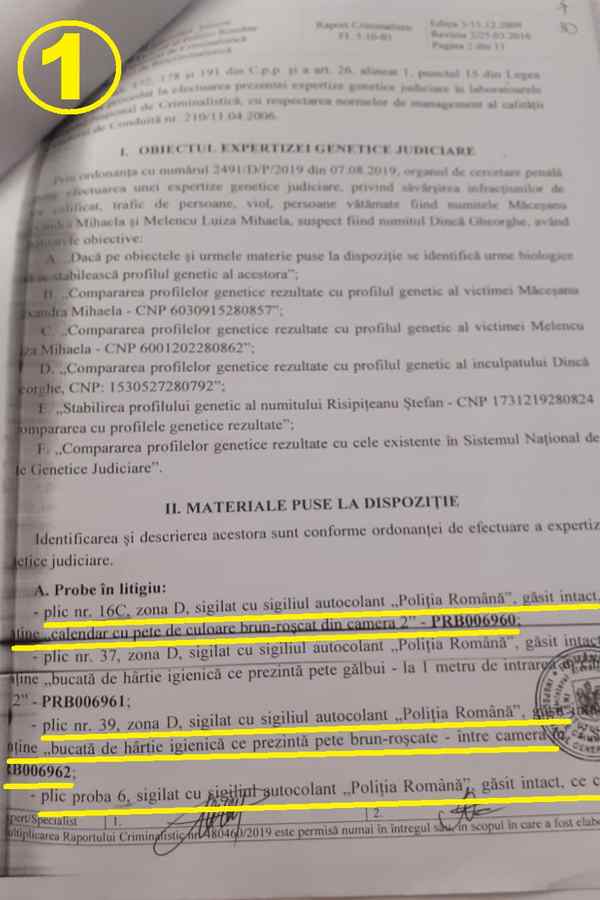 De pe prima pagină a „Raportului criminalistic” aflăm că prin Ordonanța 2491/D/P/2019 procurorii au cerut „efectuarea unei expertize genetice judiciare”, cu următoarele „obiective”: