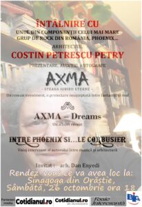 Deci sâmbătă 26 octombrie Sinagoga Orăștiană va fi locul. de la ora 18. unde vă invităm la o îmbinare între arhitectură, literatură și muzică. Avândul în centrul atenție de invitatul nostru, Costin Petrescu Petry. În încheierea evenimentului autorul lucrărilor va da dedicații.