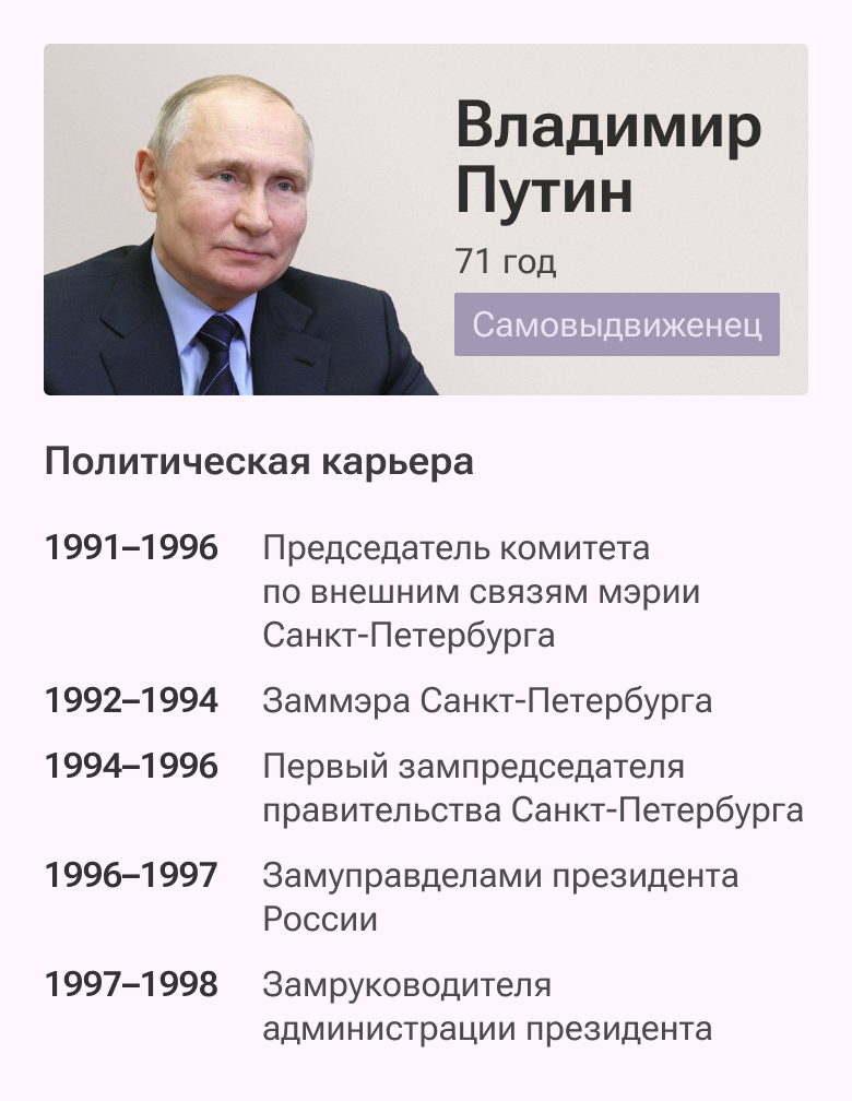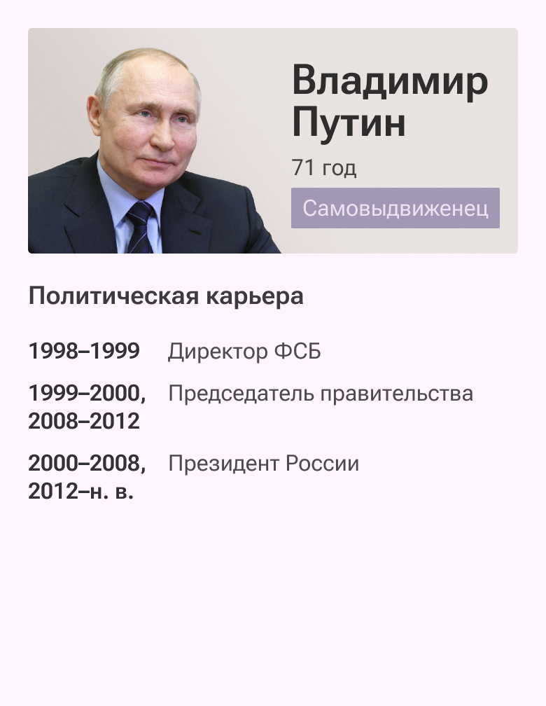 Consiliul Federației a programat alegeri prezidențiale pentru 17 martie 2024. Votul va dura trei zile: 15, 16 și 17 martie. În acest moment, 11 persoane concurează pentru postul de șef al statului.