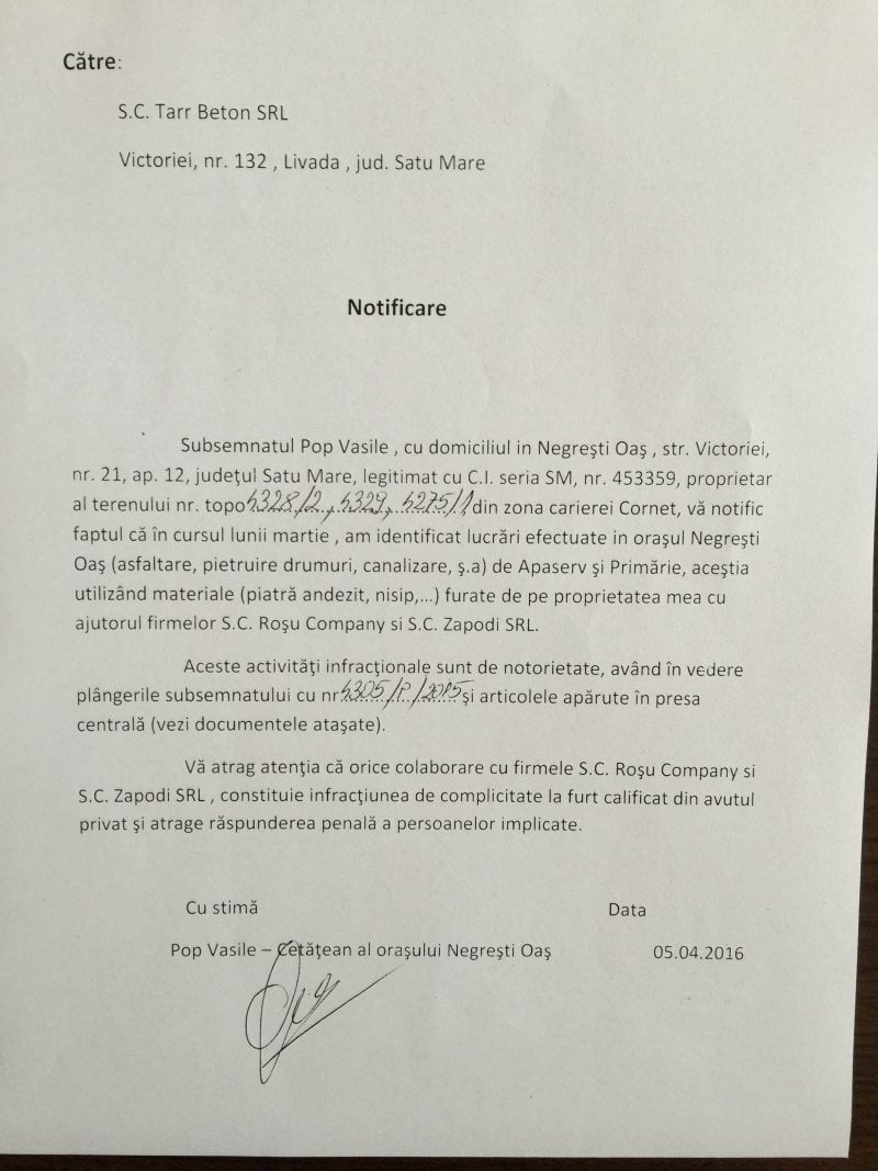 Vă punem la dispoziție notificările depuse de Vasile Pop – Frizeru către firmele executante și către Primărie ( notificare înregistrată sub numărul 6616/ 11.04.2016), în care acesta atrăgea atenția primăriței Fedorca și societății Apaserv că pavează străzile orașului cu materiale furate și îi acuza pe aceștia de complicitate la furt calificat din avutul privat.