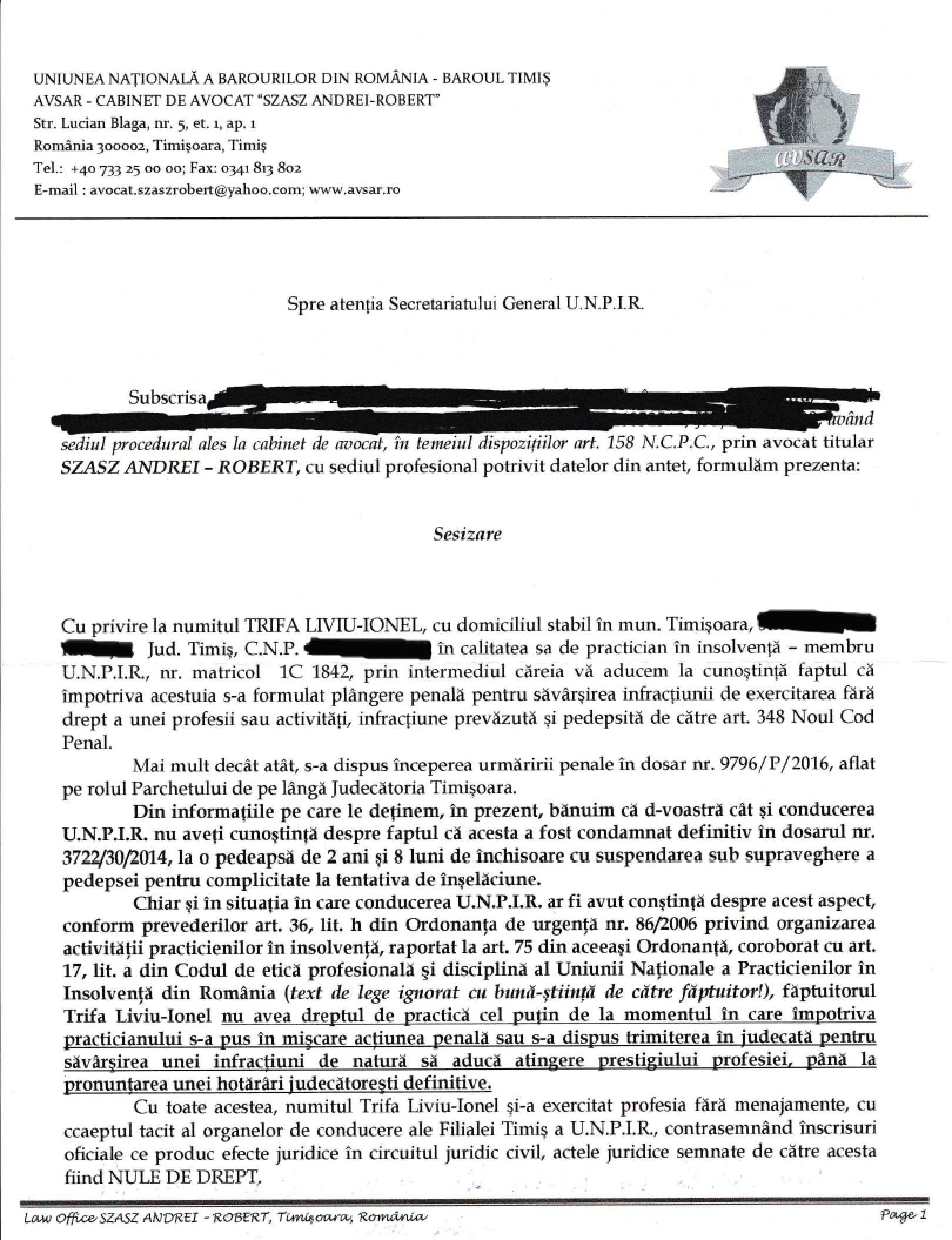 În materialul scris, depus de către un avocat timișorean și care a făcut obiectul chiar al unei ședințe a Comisiei de disciplină a UNPIR Timiș se precizează : ”făptuitorul Trifa Liviu-Ionel nu avea drept de practică cel puțin de la momentul în care împotriva practicianului s-a pus în mișcare acțiunea penală(2014 în Dosarul Zaher Iskandarani) sau s-a dispus trimiterea în judecată pentru săvârșirea unei infracțiuni de natură să aducă atingere prestigiului profesiei, până la pronunțarea unei hotărâri judecătorești definitive. Cu toate acestea, numitul Trifa Liviu-Ionel și-a exercitat profesia fără menajamente, cu acceptul tacit al organelor de conducere ale Filialei Timiș a UNPIR, consemnând înscrisuri oficiale ce produc efecte juridice în circuitrul juridic civil, actele juridice semnate de către acesta fiind nule de drept”, scrie, negru pe alb, în sezizarea despre care președinta UNPIR Timiș, Flavia Consuela Crăciun a ”uitat că ar fi existat”.