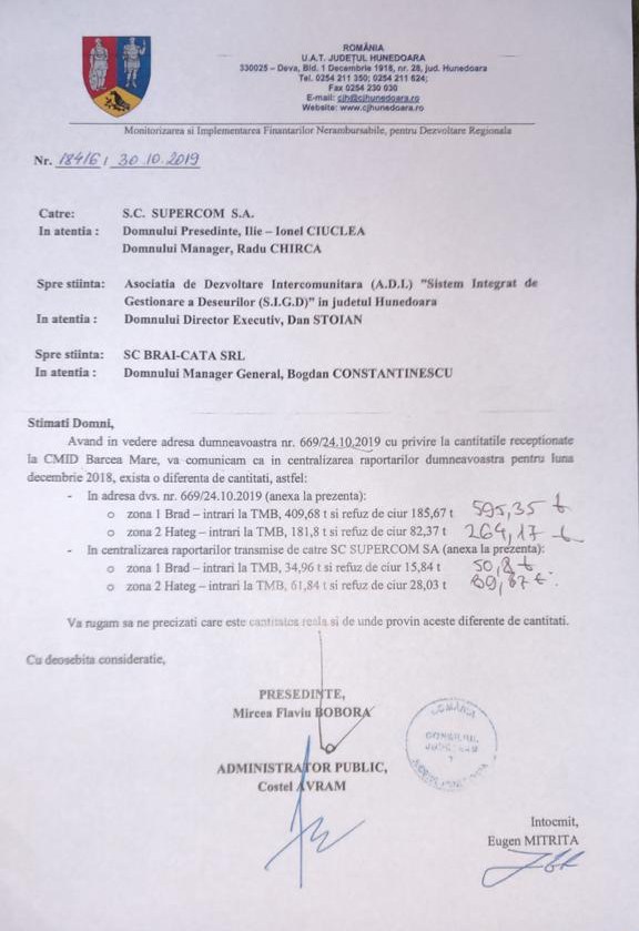 În schimb, atunci când trebuia să achite „chiria” pentru concesionarea gropii de gunoi de la Bârcea Mare, groapă făcută de CJ Hunedoara cu fonduri europene, Supercom raporta cantitatea de aproape 273 de tone de gunoi. Pentru fiecare tonă de gunoi intrată la Centrul de Management Integrat al Deșeurilor Bârcea Mare, Supercom trebuie să achite Consiliului Județean o chirie de 27,04 lei, conform contractului aprobat prin HCJ Hunedoara nr 92/2017.