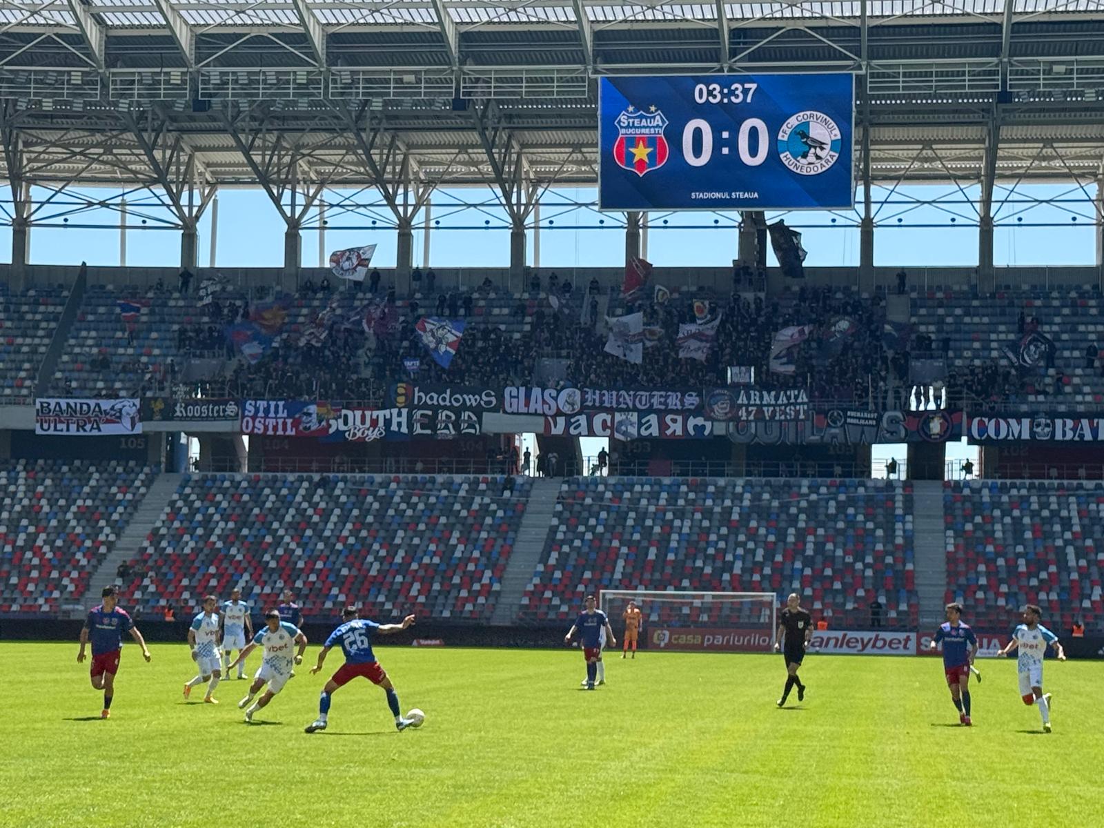 Miza partidei era din start mult mai mare pentru Corvinul. CSA Steaua în continuare nu are drept de promovare, fapt ce se reflectă și în numărul mic de spectatori din tribune. Pe lângă ultrași, doar câteva sute de oameni s-au strâns în tribunele arenei din Ghencea, deși vremea a fost perfectă pentru fotbal. Totuși, nici FCSB, echipă care pretinde că e Steaua, nu se bucură de audiențe mult mai importante. În meciul de vineri de liga 1, contra Petrolului, de-abia a strâns 6.000 de persoane în tribunele Arenei Naționale.