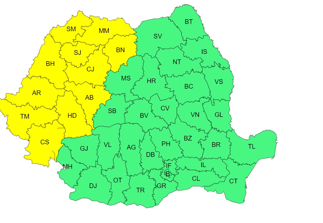 Potrivit ANM, de miercuri, 21 august, ora 14:00, până marți,22 august, ora 2:00, în judeţele Bistriţa-Năsăud, Maramureş, Satu Mare, Sălaj, Cluj, Alba, Bihor, Arad, Hunedoara, Timiş şi Caraş-Severin se vor semnala averse torenţiale, intensificări ale vântului (viteze la rafală de 50 – 70 km/h), local vijelii, descărcări electrice şi izolat grindină.