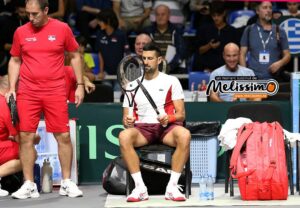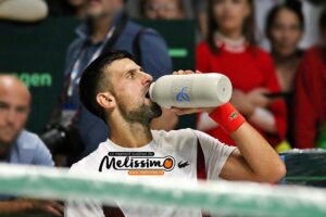 Toată lumea s-a ridicat în picioare, l-a aplaudat minute bune și i-a scandat numele de luptă „Nole”, „Nole”, „Nole”. A salutat cu pumnul ridicat spre tribune, a dat mâna cu oricine i-a ieșit în cale și s-a oprit la bancă. S-a așezat și a probat două rachete. Pe cea aleasă a pus-o lângă pe el, pe cealaltă a lăsat-o sprijinită de scaun. S-a ridicat în picioare, a băut adânc și până la fund din două sticle de plastic, una mare și albă, una subțire și albastră.