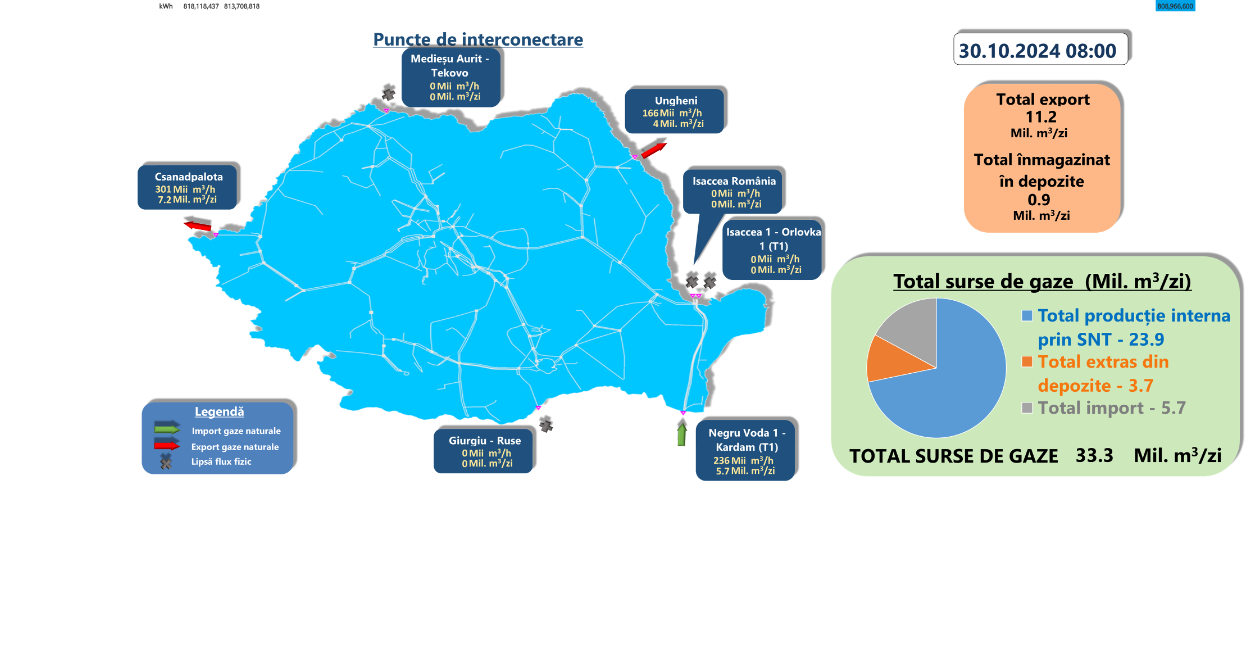 Potrivit datelor interactive Transgaz, azi intră în țară 5,7 milioane mc de gaze via ruta bulgărească și ies 11,2 milioane mc(7,2 milioane mc către Ungaria, restul către Moldova). Așadar, pe lângă tranzitul ce-l asigurăm pentru unguri, exportăm și gaz de producție locală.