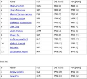 Tabelul alăturat îi include pe toți jucătorii înscriși în circuit, precum și locurile pe care aceștia le ocupă în cele două versiuni (URS și FIDE).