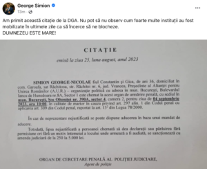 Ce scrie Simion pe Facebook. „Am primit aceasta citație de la DGA. Nu pot să nu observ cum foarte multe instituții au fost mobilizate în ultimele zile ca să încerce să ne blocheze.