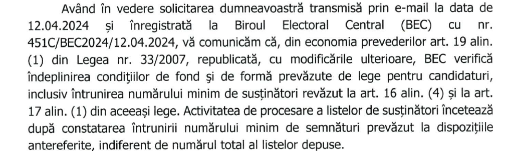 Astfel, la cererea trimisă de Cotidianul.ro în baza Legii 544/2001 către BEC în care solicitam „numărul de susținători aferent fiecărei liste de candidaturi depuse pentru Alegerile pentru Parlamentul European din 9 iunie 2024 de către o serie de competitori electorali“, răspunsul este uluitor: