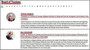 Două nume din board-ul „Friends of Europe” ne atrag atenţia: Etienne Davignon, care este chiar Preşedintele ONG-ului, şi Guy Verhofstadt, membru în board-ul ONG-ului, ambii de origine belgiană.