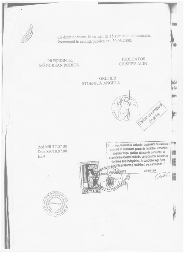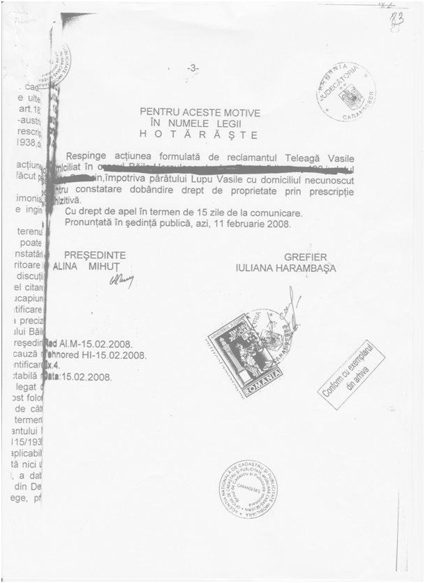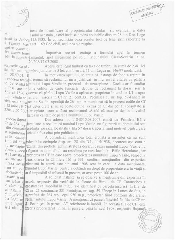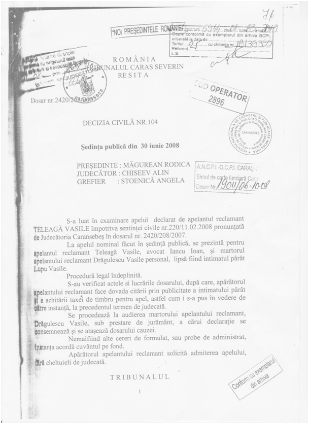 Împotriva acestei sentinţe, Teleagă Vasile a formulat un apel la Tribunalul Caraș Severin, iar acestă instanță conform deciziei civile nr.104 din 30 iunie 2008 a admis apelul.