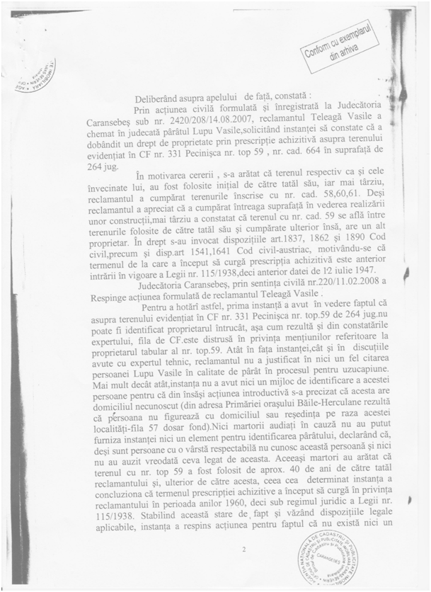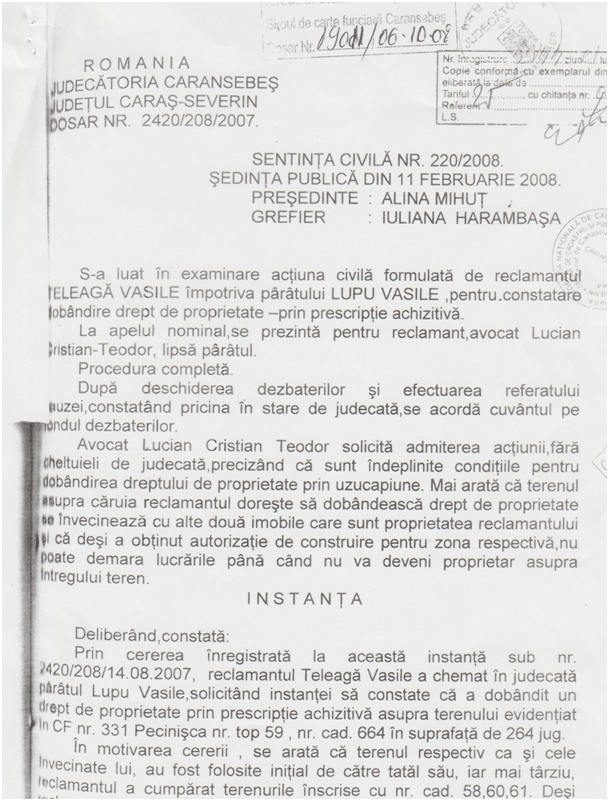 În anul 2007, Teleagă Vasile formulează o acțiune împotriva numitului Lupu Vasile, pentru stabilirea dreptului de proprietate prin prescripție achizitivă asupra terenului din parcul Vicol teren, evidențiată în Cartea Funciară număr 21/331 a localității Pecinișca, județul Caraș-Severin, cu numărul topo 59, compus din fânețe, situat în locul numit Lunca de Sus, în intravilanul localității Băile Herculane. Această acțiune a fost înregistrată sub numărul 2420/208/2007, iar în motivarea acțiunii se arată că terenul respectiv ca și cele învecinate lui, au fost folosite inițial de către tatăl său, iar mai târziu, reclamantul a cumpărat terenurile înscrise cu nr. Cad. 58,60,61.