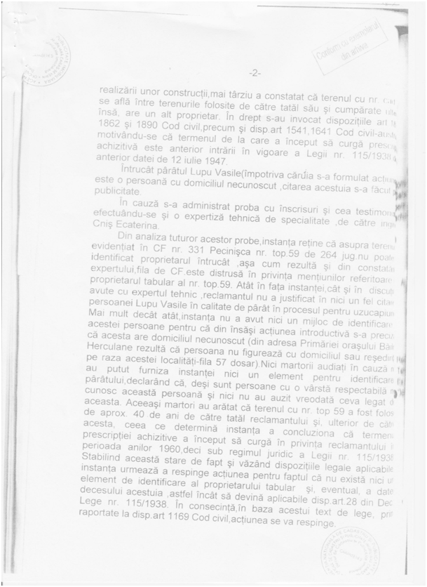 Martorii audiați, Sârbu Grigore și Lalescu Constantin, au arătat că terenul cu nr. Topo 59 a fost folosit timp de aproximativ 40 de ani de către tatăl reclamantului și, ulterior, de către acesta. După foarte multe discuții, cu foarte multe persoane din Herculane nu am putut să aflu nici măcar cum arată tatăl acestui Teleagă Vasilică.