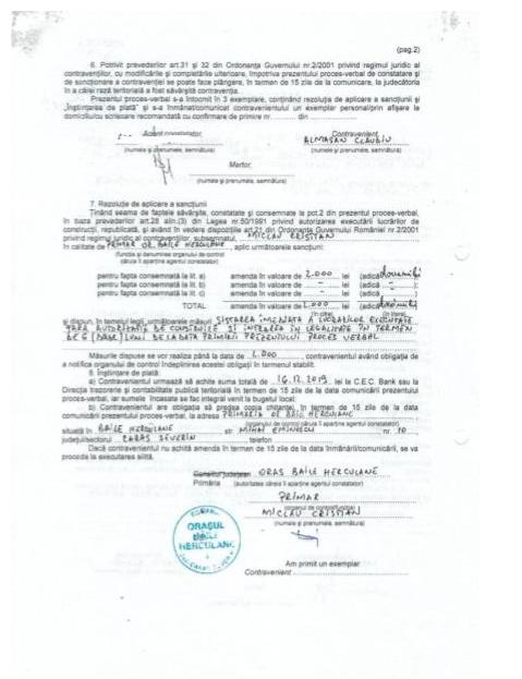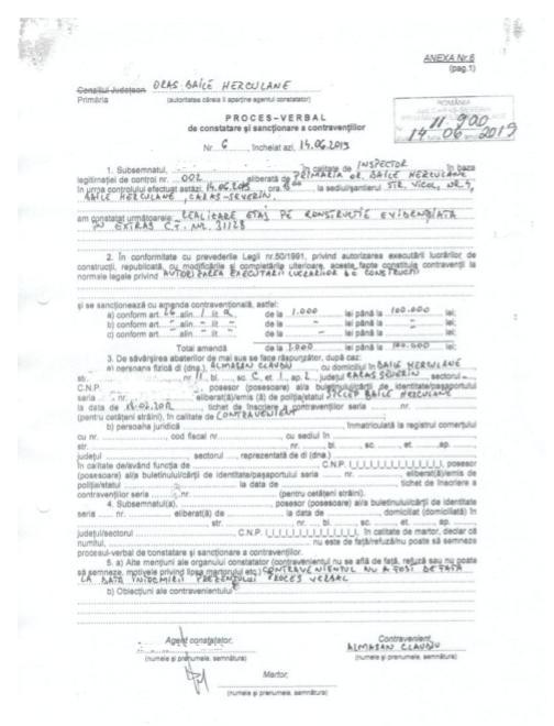 Pe lângă diletantismul ce străbate din modul de întocmire a acestui proces-verbal şi halucinanta sancţionare a unei persoane care nu este proprietarul acelui imobil, lucru care se poate observa fără investigaţii speciale, din simpla lecturare a extrasului CF, despre care tocmai inspectorii primăriei au făcut vorbire, nu pot să nu constat cu stupoare că, într-o zonă precum Staţiunea Băile Herculane, unde se ridică zeci de construcţii la fiecare minut, până în luna iunie a acestui an, inspectorii au aplicat impresionata cifră de ……………… 6 PROCESE-VERBALE DE CONTRAVENŢIE!?!?.