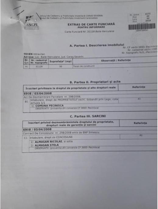 Continuăm seria anomaliilor şi a haosului instituţional din staţiunea Băile Herculane, cu o altă stare de fapt care ridică mari semne de întrebare privind competenţa şi buna-credinţă a unor funcţionari ai statului. La data de 14.06.2019 inspectorii din cadrul Primăriei Băile Herculane au întocmit procesul-verbal de contravenţie nr. 6 reţinând numele contravenientului ca fiind Almășan Claudiu, în loc de Almășan Nicolae, titularul dreptului de concensiune conform extrasului CF nr. 31128, extras despre care se face vorbire în procesul-verbal de contraveţie, reţinându-se că a fost realizat un etaj la o construcţie evidenţiată în acest extras CF.