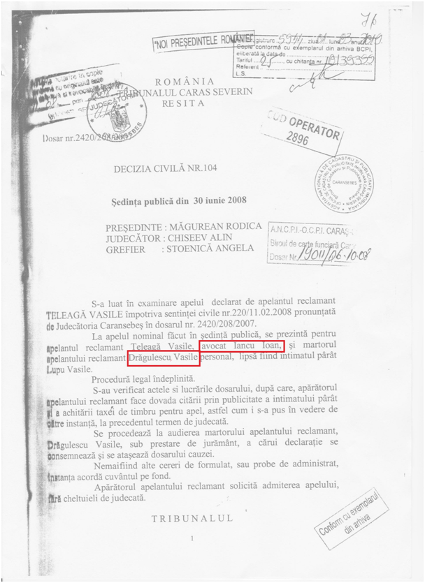Se pare că, potrivit mărturiilor unor persoane, acest avocat a făcut toate jocurile la Tribunalul Caraș-Severin pentru ca instanța să admită recursul, iar doamna prim-procuror a clasat sau declinat tot ce i-a fost repartizat cu privire la Teleagă Vasile.