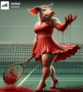 Sabalenka, acuzată în trecut că nu s-a dezis de regimul Lukașenko, s-a ales cu o caricatură horror: cap de porc și din mână și rachetă curgându-i sânge.