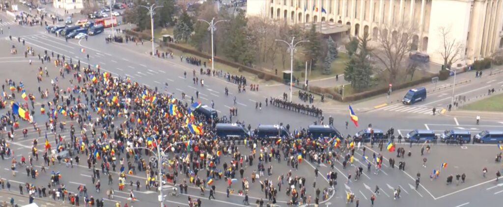 Jandarmeria Capitalei anunţă că sindicaliştii din Piaţa Victoriei au comunicat că nu sunt de acord cu prezenţa susţinătorilor lui Georgescu, fiind luate măsuri pentru separarea celor două grupuri.