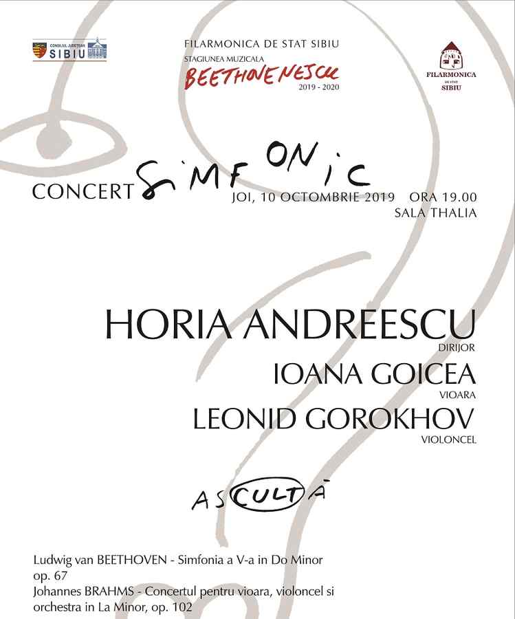 După o lună septembrie care l-a adus pe dirijorul Horia Andreescu alături de Orchestra Simfonică a Radiodifuziunii din Viena în două concerte remarcabile la Ateneul Român în cadrul Festivalului Internaţional „George Enescu” de la București și la Festivalul Internaţional “Herbstgold” de la Eisenstadt, în luna octombrie Horia Andreescu va semna la Sala Thalia deschiderea stagiunii Orchestrei Filarmonicii de Stat din Sibiu aflată sub un nou management începând din această stagiune. Programul va cuprinde Dublul concert pentru vioară, violoncel și pian în la minor op. 102 de Brahms, avându-i ca soliști pe Ioana Goicea – vioară  și pe Leonid Gorokhov – violoncel și, în partea a doua a serii, Simfonia a V-a în do minor op. 67 de Beethoven.