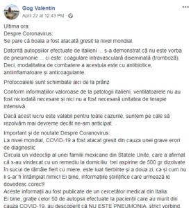 Numire controversată în fruntea spitalului din Câmpeni. Ministrul Sănătății l-a numit manager pe Valentin Tiberiu Gog, consilier local PNL, economist, director comercial al unui restaurant, care s-a remarcat printr-o postare în care arăta că noul coronavirus poate fi combătut cu ”trei aspirine de 500 gr dizolvate în sucul de lămâie fiert cu miere” și că ”ventilatoarele nu au fost niciodată necesare și nici unitatea de terapie intensivă” (foto mai jos).