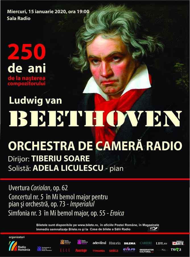 Miercuri, 15 ianuarie (19:00), ORCHESTRA DE CAMERĂ RADIO prezintă, sub bagheta apreciatului dirijor TIBERIU SOARE, două dintre creațiile devenite legendare ce poartă semnătura ”titanului” Beethoven: Concertul nr. 5  pentru pian şi orchestră –  Imperialul și Simfonia nr. 3 – Eroica. Concertul va fi difuzat și în rețeaua Uniunii Europene de Radio (EBU – European Broadcasting Union), în cadrul proiectului Beethoven – 250, ce reunește concerte de excepție de la toate radiodifuziunile membre.
