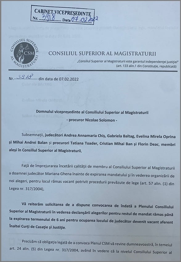 Într-un Comunicat adresat procurorului Nicolae Solomon, vicepreședintele CSM, șapte magistrați din CSM, procurori și judecători, îi solicită convocarea de urgență a Plenului CSM în vederea alegerii noului Președinte al CSM, după încheierea mandatului deținut de judecătorul Bogdan Mateescu pînă la începutul acestui an.