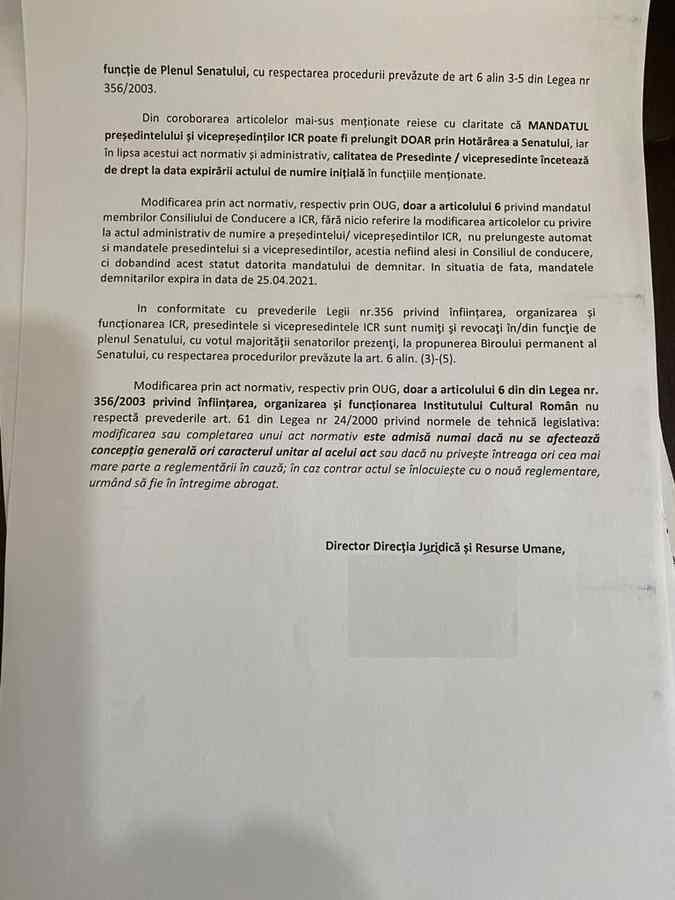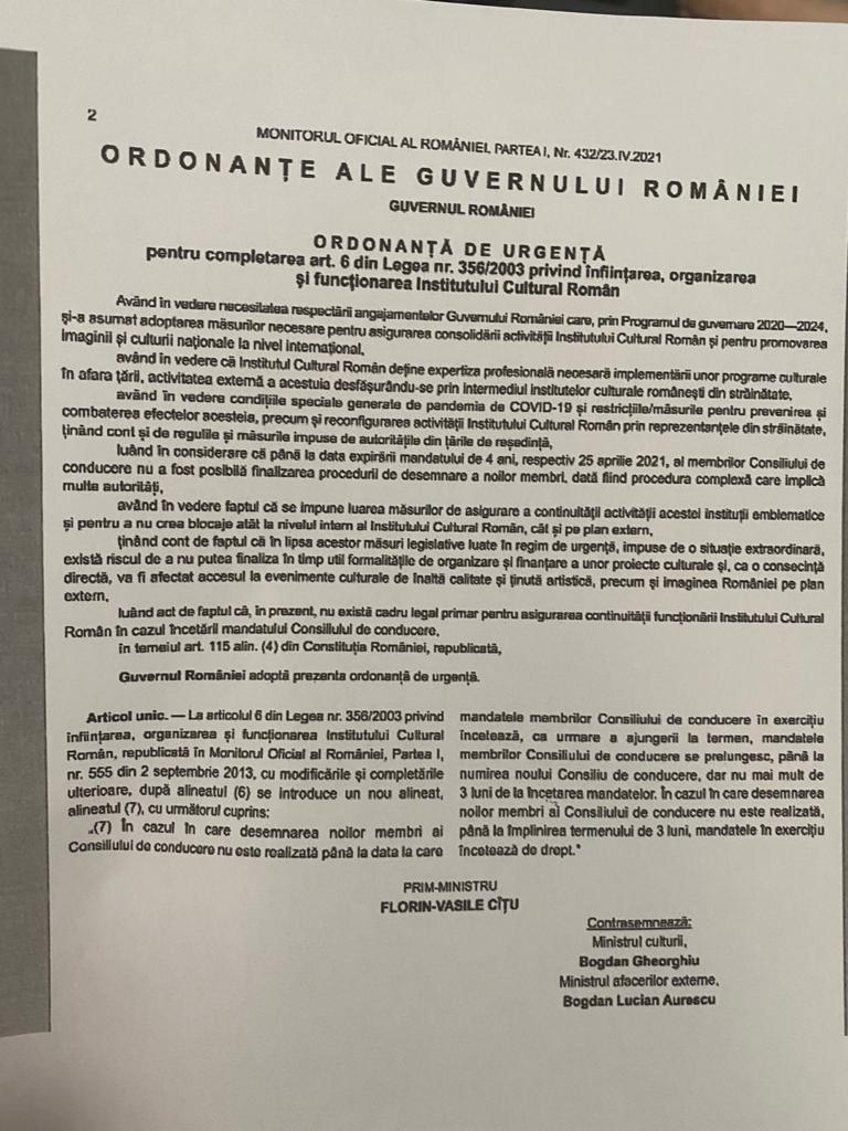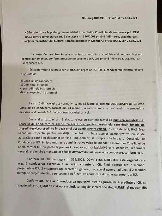 „Modificarea prin act normativ, respectiv prin OUG, doar a articolului 6 privind mandatul membrilor Consiliuiui de Conducere a ICR, fără nicio referire la modificarea articolelor cu privire la actul administrativ de numire a președintelui/ vicepreședinților ICR, nu prelungcște automat și mandatele președintelui și a vicepreședintilor, aceștia nefiind aleși în Consiliul de conducere, ci dobândind acest statut datorită mandatulul de demnitar. În situația de față, mandatele demnitarilor expiră în data de 25.04.2021.„, se arată în NOTA referitoare la prelungirea mandatului membrilor Consiliulul de conducere prin OUG nr.32 pentru completarea art. 6 din Legea nr. 356/2003 privind înființarea, organizarea și funcționarea Institutului Cultural Român, publicată în Monitorul oficial nr.432 din 23.04.2021.
