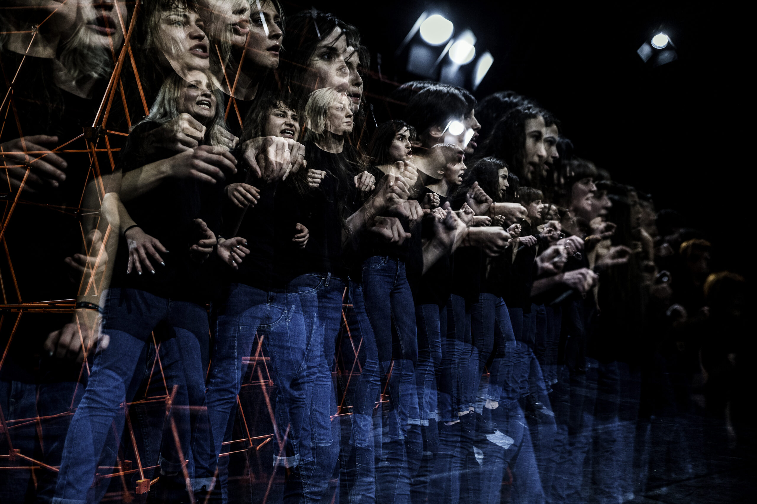 De aceea ne-am concentrat foarte mult – și acum vorbesc destul de chirurgical artistic, poate – ne-am concentrat foarte mult pe ce a însemnat containerul portocaliu care se afla la ieșirea din Colectiv sau la intrare și unde practic au rămas blocați foarte mulți oameni din interior, în încercarea de a ieși afară. Era un container industrial din metal, care avea niște uși, care nu s-au deschis, care oricum îngusta foarte mult trecerea prin el și care era pus acolo într-un efort de design al celor care au avut clubul și care el însuși avea o încărcătură poetică, cumva, în spectacolul nostru. Este și un personaj în sine containerul de la intrare.