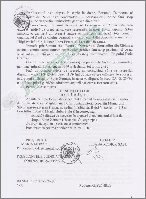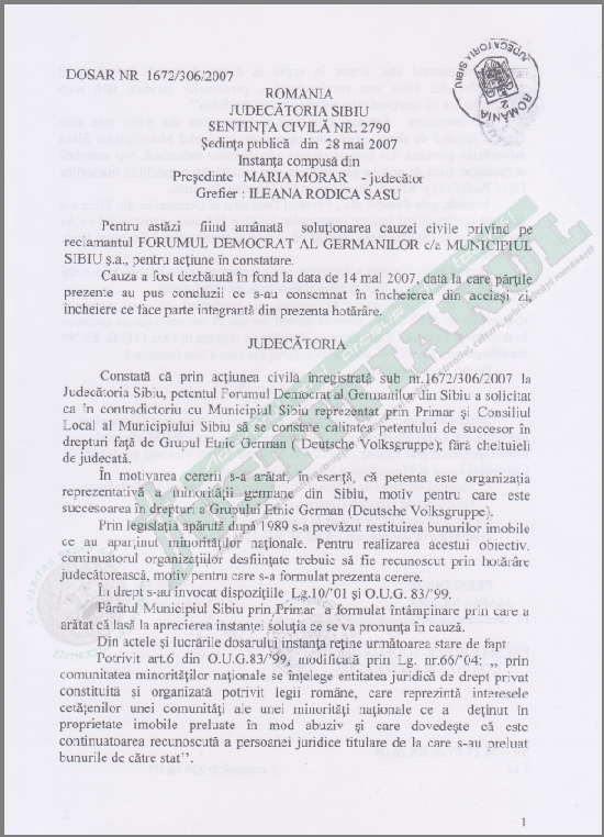 Iată un singur exemplu, sentinţa prin care FDGR devenea succesorul şi moştenitorul organizaţiei fasciste „Grupul Etnic German”, pe care apare sigla „Justiţiarul”: