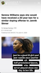 Uluită de suspendarea primită de Jannik Sinner, Serena Williams s-a victimizat afirmând că dacă aș fi făcut ea asta ar fi primit 20 de ani.