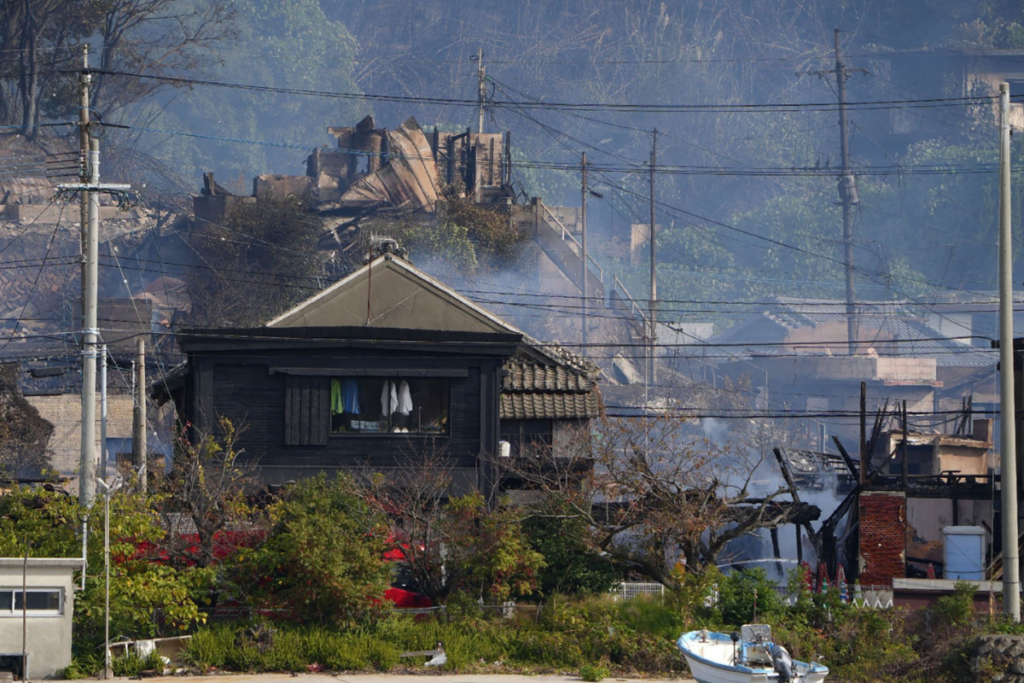 Imaginile difuzate de televiziune arată case transformate în ruine și coloane groase de fum ridicându-se deasupra cartierului Saganoseki.