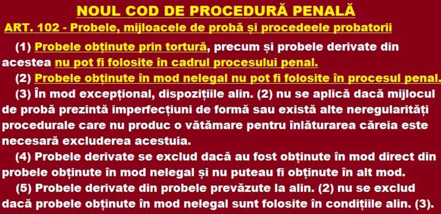 Articolul face, în acest sens, trimitere la art. 102 din NCPP, unde se definesc aceste probe ce trebuie să fie excluse în faza judecăţii pe fond, adică a procesului propriu zis: