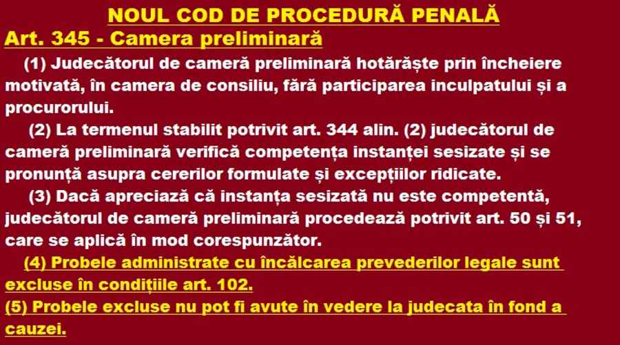 Aşadar, procedura de cameră preliminară se desfăşoară în lumina prevederilor articolului 345 din Noul Cod de Procedură Penală, unde se definesc atribuţiile completului: