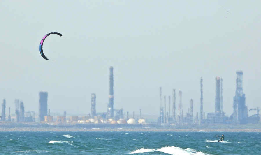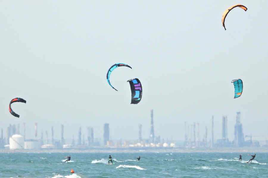 Mai mulți kitesurferi profită de vântul numai bun pentru practicarea acestui sport, în Mamaia.