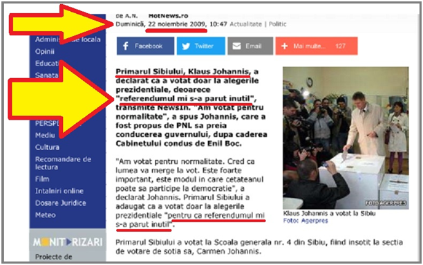 O descoperire senzaţională a făcut presa, recent: în anul 2009, cînd s-a organizat un Referendum simultan cu alegerile prezidenţiale, la ieşirea din secţia de votare, Klaus Iohannis a declarat: „REFERENDUMUL MI S-A PĂRUT INUTIL”! Atunci, în 2009, Referendumul a fost propus de Traian Băsescu şi a fost complet inutil, fostul preşedinte recunoscînd zilele acestea că a fost o greşeală pentru că, deşi a fost validat, referendumul n-a putut fi pus în practică, fiind necesară modificarea Constituţiei.