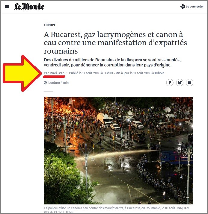 În articolul său, Mirel Bran îl citează chiar pe Klaus Iohannis, care acuza Jandarmeria: „Vendredi, le président libéral Klaus Iohannis a affiché sa solidarité avec les manifestants et a aussitôt réagi au zèle policier du gouvernement. «Je condamne l’intervention brutale de la gendarmerie, disproportionnée par rapport à l’attitude paisible de la plupart des manifestants», a-t-il déclaré”. De asemenea, reproduce declaraţia unui participant la miting, Nicuşor Vasile, care spune: „Pourquoi une telle violence ? Nous ne céderons pas. J’envoie l’argent que je gagne en Roumanie et qu’est-ce que je reçois en échange ? Du gaz lacrymogène et des jets d’eau sur la tête”.