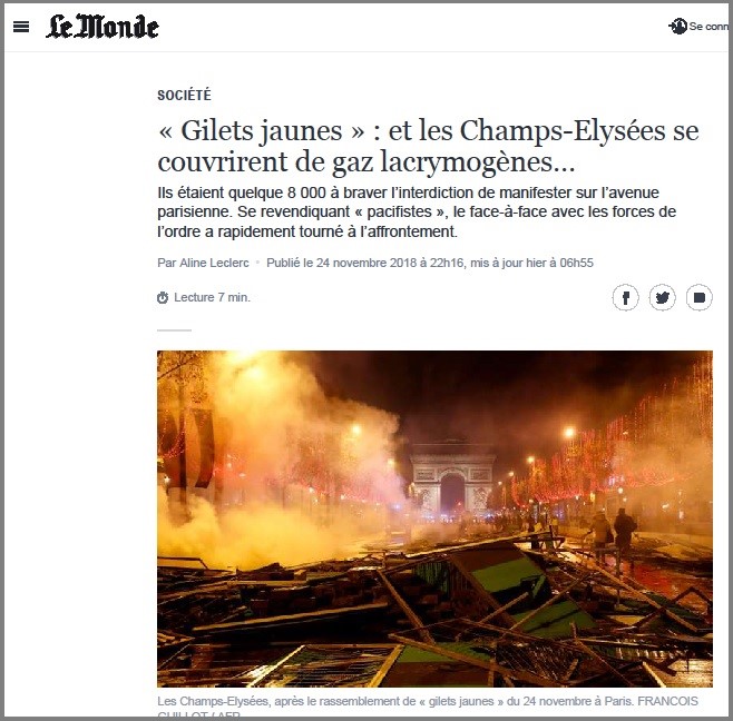 Iată, însă, că acum, în mijlocul Parisului, au loc proteste extrem de violente ale aşa numitelor „gilets jaunes” (vestele galbene), împotriva cărora jandarmii francezi au folosit exact aceleaşi mijloace ca jandarmii români în 10 august: gaze lacrimogene şi tunuri de apă, după cum citim tot în „Le Monde”: