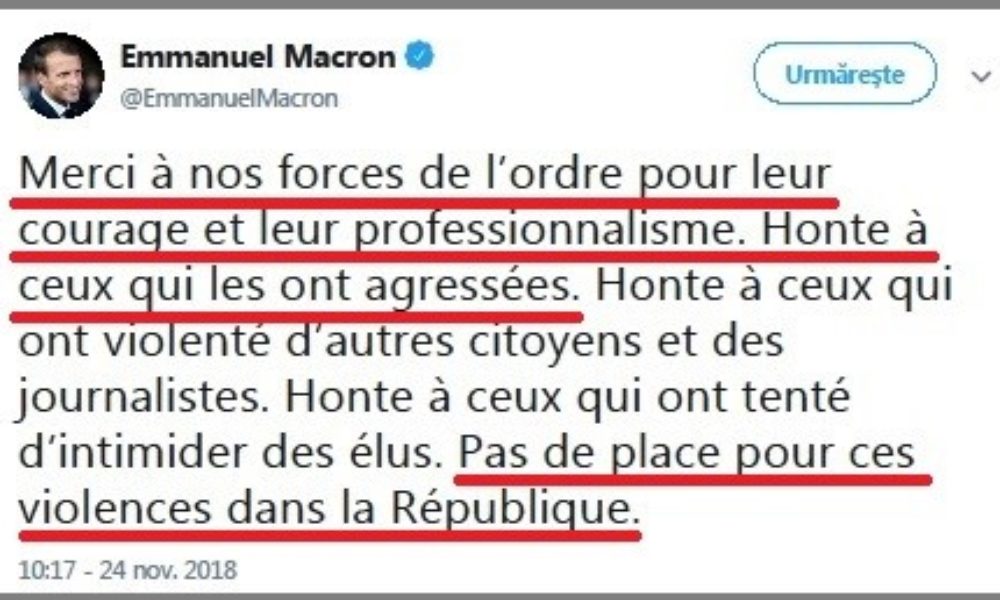 Poate că nu e lipsit de interes să aflăm ce a declarat Emmanuel Macron, preşedintele Franţei, după aceste proteste. Iată ce a scris pe pagina sa de Twitter: