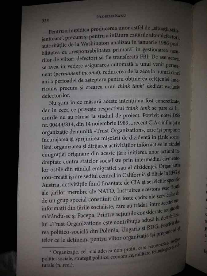 Nota strict secretă a Direcției pentru Securitatea Statului nr. 004441814 din 14 noiembrie 1989 menționează că „recent CIA a înființat o organizație denumită Trust Organization, care își propune încurajarea și sprijinirea mișcării de disidență în țările socialiste; organizarea și dirijarea activităților informative în rândul emigrației originare din aceste țări; inițierea unor acțiuni îndreptate contra statelor socialiste prin intermediul elementelor ostile din rândul emigrației sau al disidenței. Organizația nou-creată își are sediul central în California și filiale în RFG și Austria, activitățile fiind finanțate de CIA și serviciile speciale ale țărilor membre ale NATO”. Trei decenii mai târziu, aceeași organizație Trust continua finanțarea „democrației” în România.