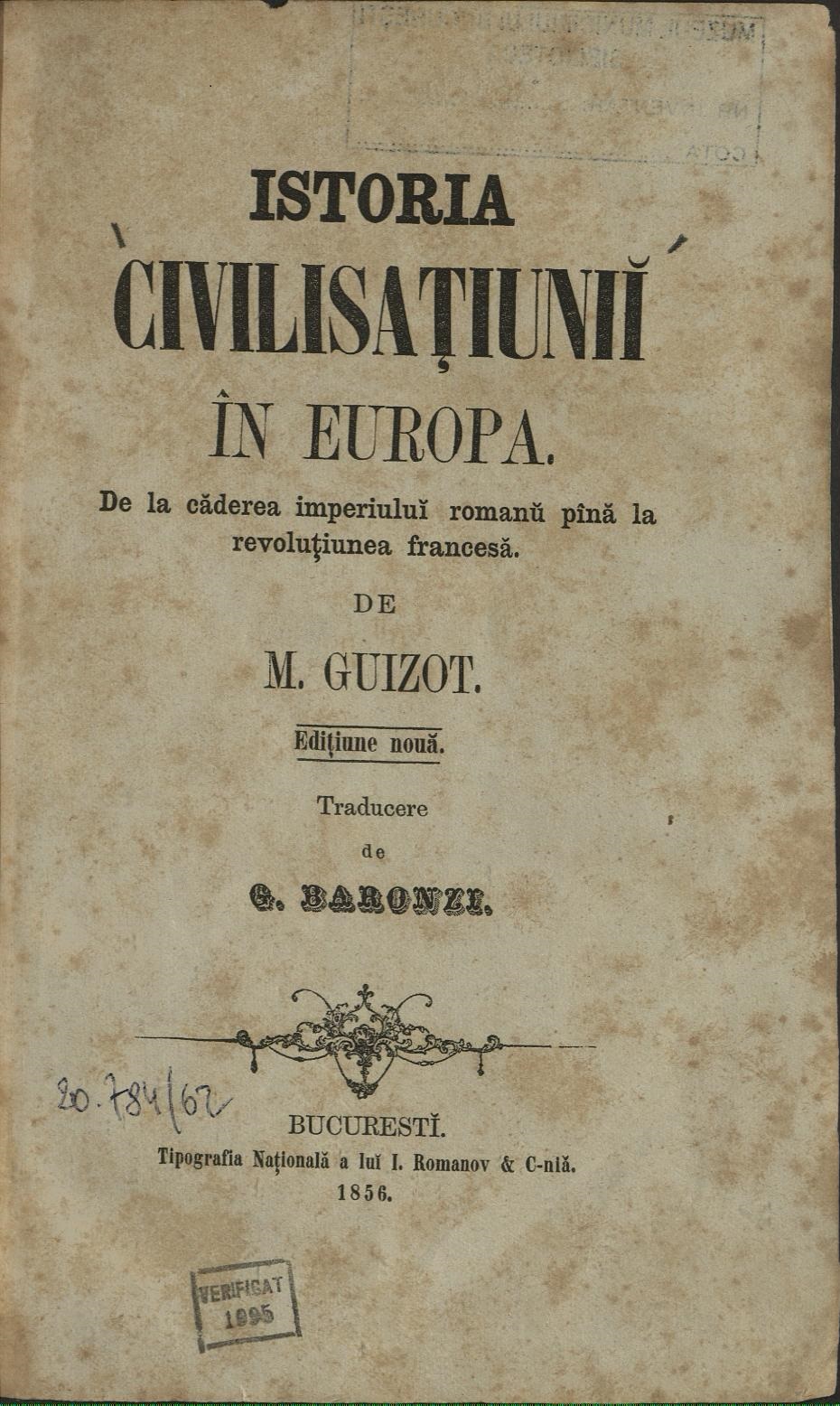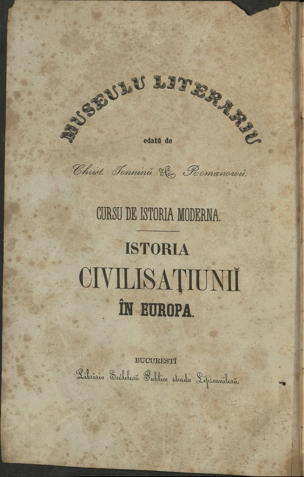 Fig 2-3: Menționarea Tipografiei Naționale I. Romanov și Compania și a  Librăriei Școlilor Publice pe manualul Istoria civilisațiunii în Europa de François Guizot editat de Iosif Romanov și Christache Ioanin în 1856 (exemplar Biblioteca MMB)