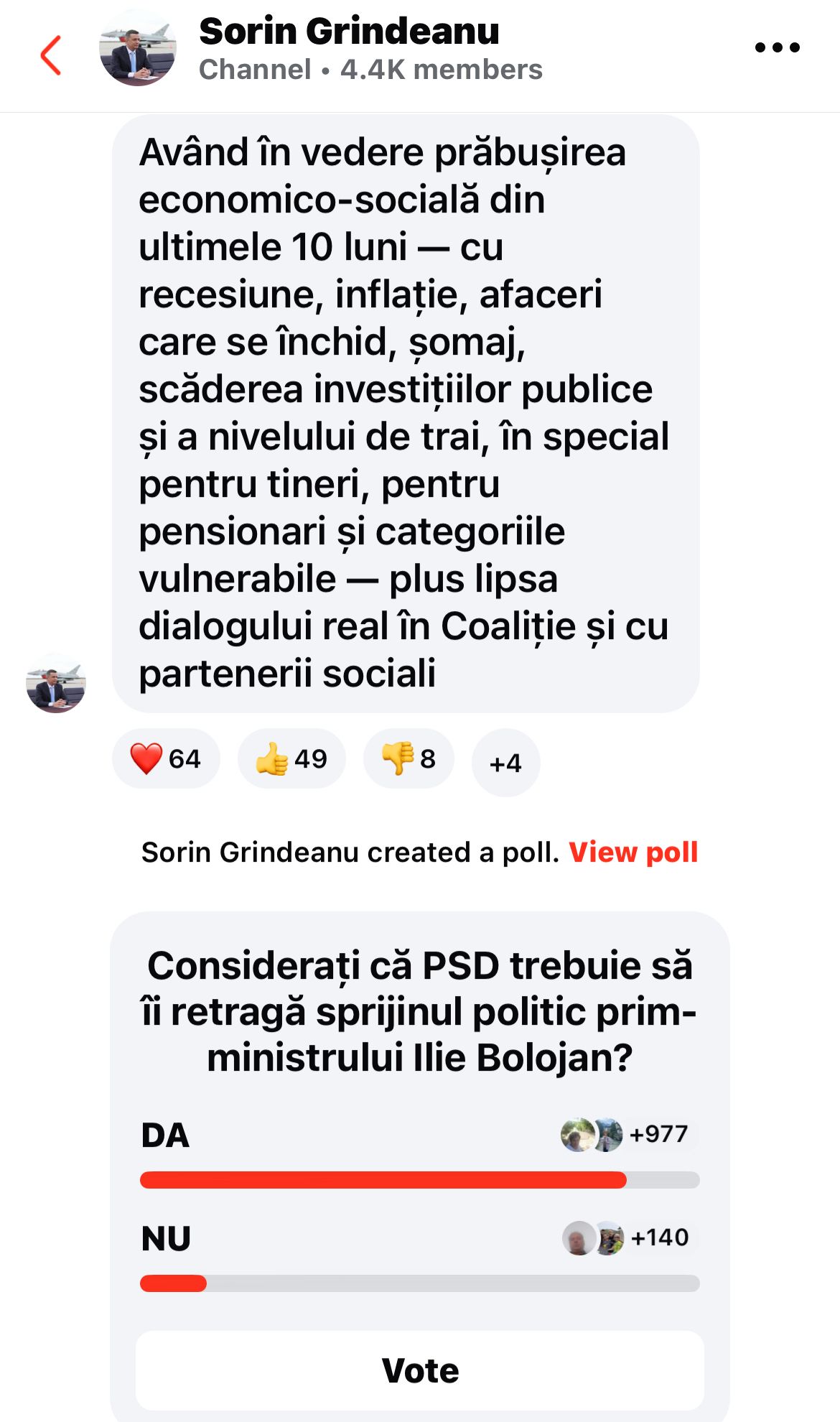 La ora 14:03, 977 de persoane au votat în favoarea retragerii sprijinului pentru Ilie Bolojan, în timp ce 140 consideră că PSD ar trebui să rămână în spatele premierului.