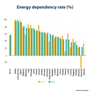 Rata de dependență arată măsura în care o economie se bazează pe importuri pentru a-și satisface nevoile energetice. Se măsoară prin ponderea importurilor nete (importuri – exporturi) în consumul brut de energie internă (adică suma de energie produsă și importurile nete). În UE în 2018, rata de dependență a fost egală cu 58%, ceea ce înseamnă că mai mult de jumătate din nevoile energetice ale UE au fost satisfăcute de importurile nete. Această rată variază de la peste 90% în Malta, Luxemburg și Cipru și sub 25% în România, Danemarca și Estonia. Rata de dependență de importurile de energie a crescut începând cu anul 2000, când era doar 56%.