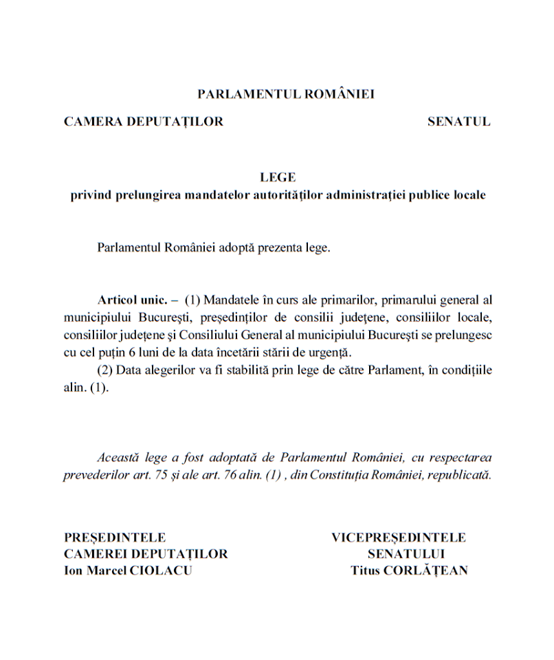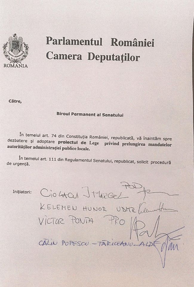 Liderii ALD, PSD, UDMR și Pro România au depus proiectul de lege privind prelungirea mandatelor autorităților administrației publice locale, pentru a fi dezbătut în procedură de urgență. Informația vine chiar de la liderul ALDE, Călin Popescu Tăriceanu. Politicianul mai afirmă că: