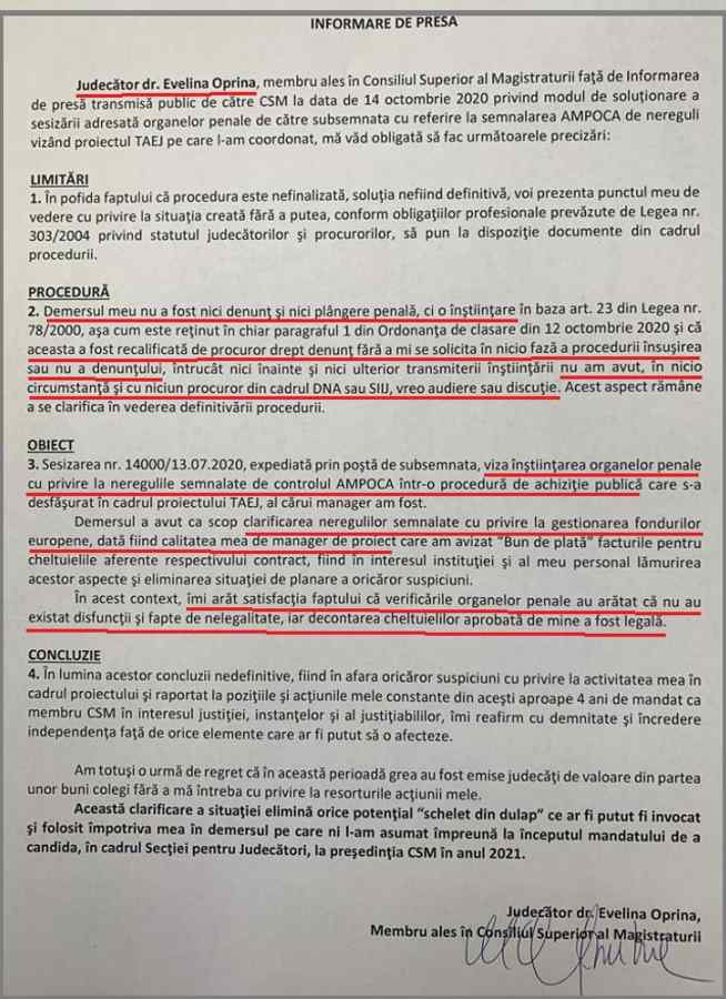 Cu atît mai clare sînt lucrurile, cu cît, aşa cum precizează chiar Evelina Oprina în documentul de mai sus, „verificările organelor penale au arătat că nu au existat disfuncţii şi fapte de nelegalitate”! Fără acea sesizare a Evelinei Oprina, o astfel de concluzie n-ar mai fi existat, iar întregul Proiect TAEJ ar fi rămas nu numai sub suspiciunea de fraudă, ci chiar că aceasta ar fi fost acoperită de CSM!