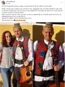 „Am fost împreună la bine și la greu, împreună de 32 de ani, până în ultima clipă… Astăzi, iubirea mea, modelul meu, echilibrul meu, dragostea mea, minunatul bărbat al vieții mele cu care am împărțit griji, nevoi și bucurii nenumărate într-o poveste de iubire cum numai Marinel i-a putut compune muzica și textul…