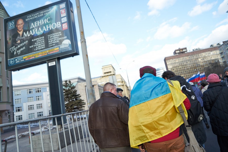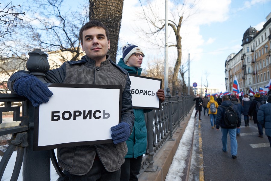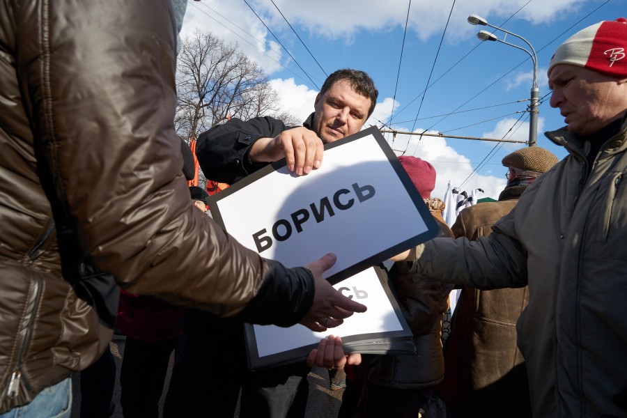 Oamenii au purtat în mâini pancarde cu inscripția „luptă”, fotografii ale lui Boris Nemțov, drapele ale Federației Ruse. unii au purtat pe spate ținte de ochit.